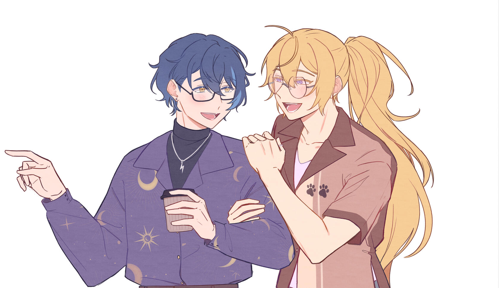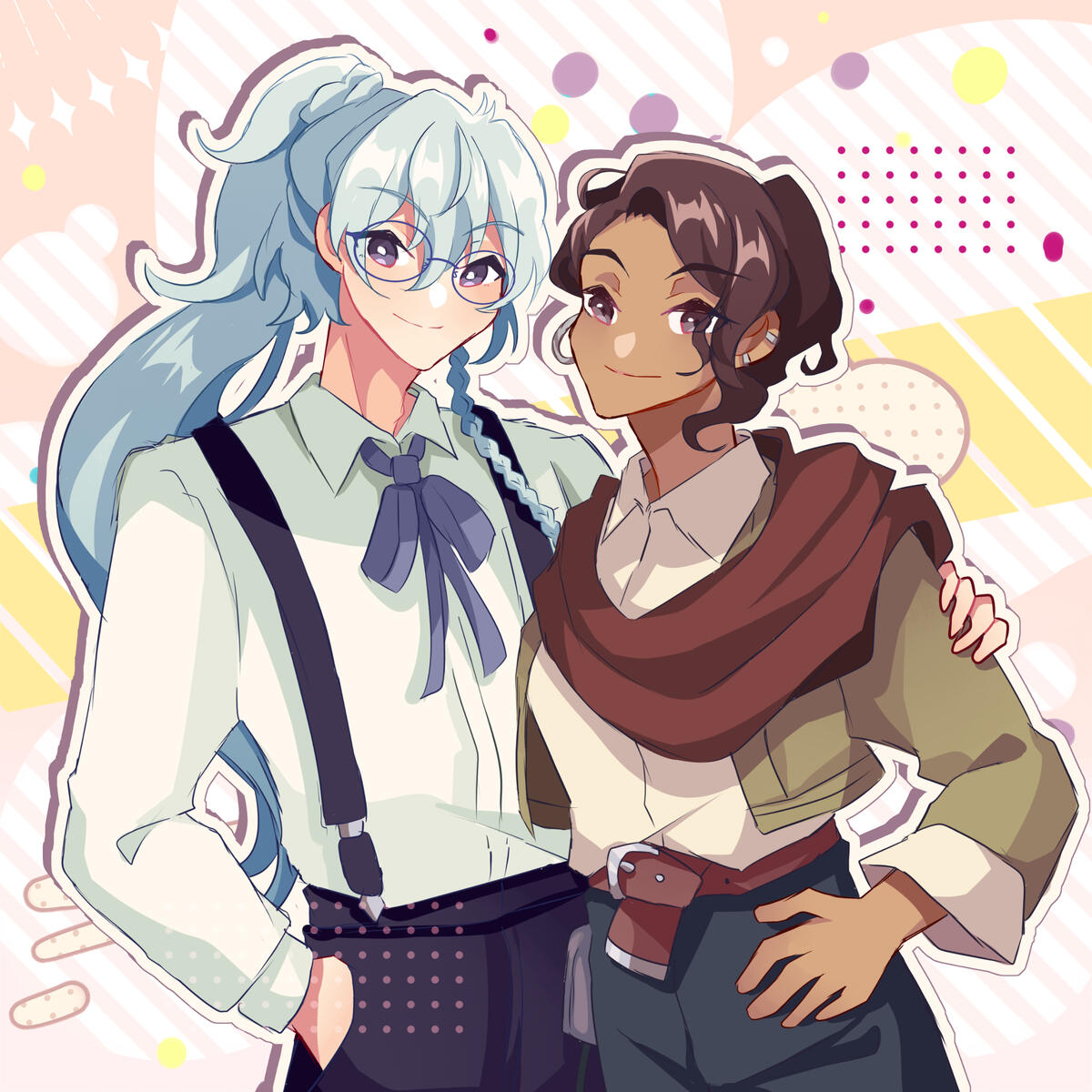 Notes: Wally and Eiden's designs in their universe are based off of Eichi and Wataru in-universe, like factive/introjects of those people in-universe (the people behind the sona thinks its funny to incorporate who they are introjected off of in this way, so its for the bit). Reference sheet art TBD, but note that the shapeshifting aspect of a character who is based on someone who is white-indigenous means there are artworks that are pre-solidifcation of the sona's reference sheet. Most art going forward will be adjusted based on if it's Wally or Eiden in front (Wally = blue/silver hair with more semi-formal wear, Eiden = blond with more casual wear; Wally is more attached to Tsumugi and Eiden to Zarina). Earlier arts might feature them with lighter skin than in later arts for this reason.